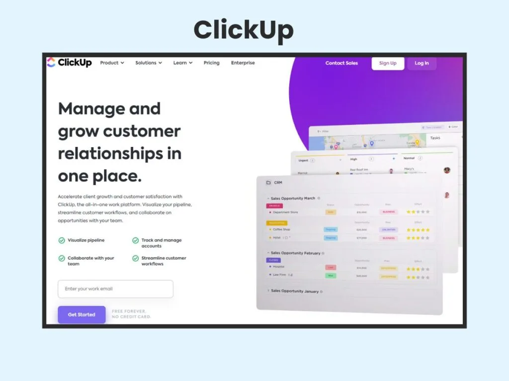 Not strictly a CRM, ClickUp’s powerful task management and collaboration features can be adapted to manage customer relationships effectively. Think of it as your flexible workspace for juggling both internal and external interactions.